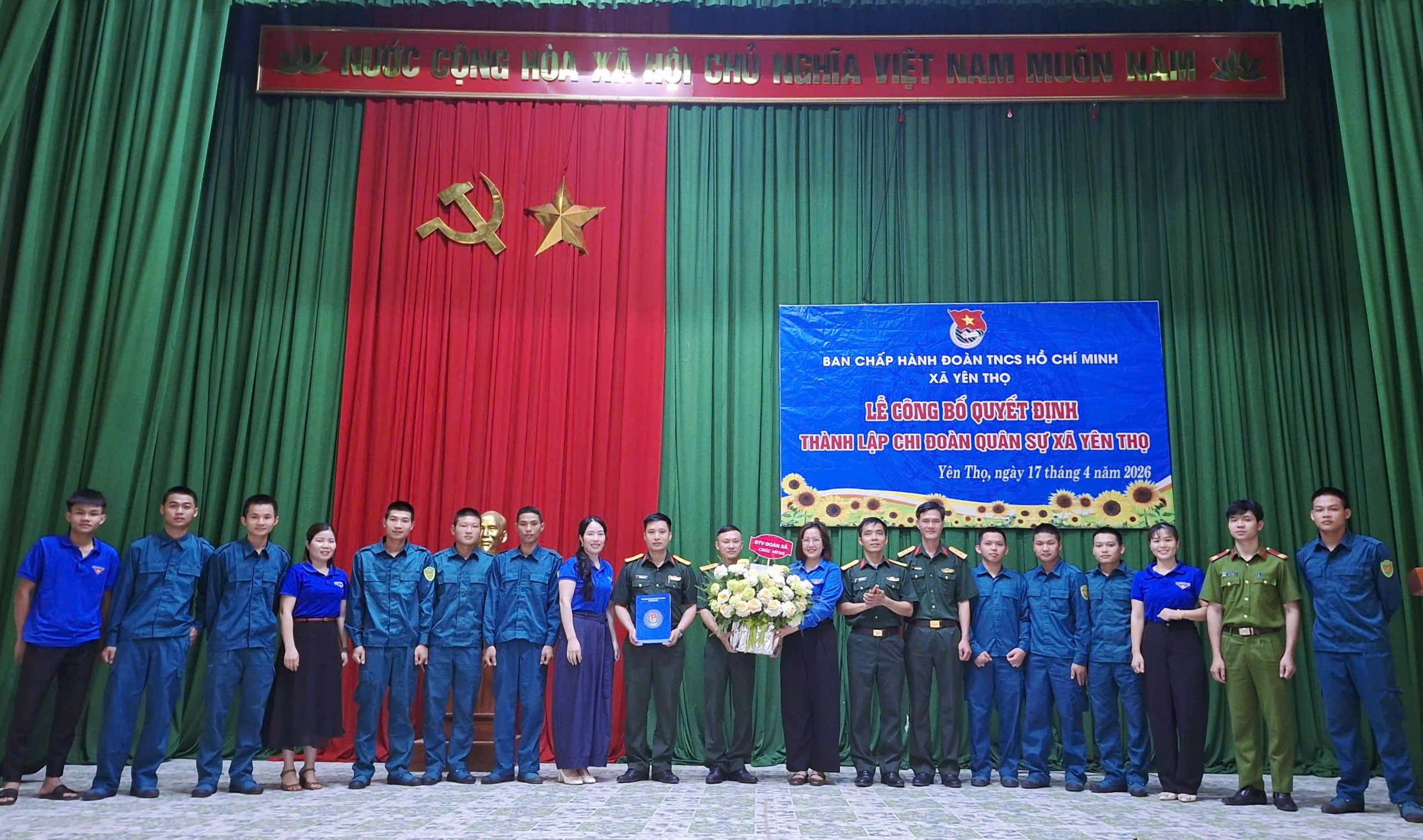 Chiều 17/4/2026, Đoàn Thanh niên xã Yên Thọ tổ chức Lễ công bố Quyết định thành lập Chi đoàn Quân sự xã. Đây là bước cụ thể hóa chủ trương tăng cường sự lãnh đạo của Đảng đối với công tác thanh niên trong lực lượng dân quân, góp phần xây dựng lực lượng vũ trang cơ sở vững mạnh, đáp ứng yêu cầu nhiệm vụ quốc phòng – an ninh trong tình hình mới.