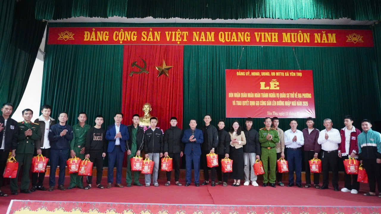 Chiều 11/2/2026, Đảng ủy, HĐND, UBND, Ủy ban MTTQ Việt Nam xã Yên Thọ long trọng tổ chức Lễ trao quyết định gọi công dân lên đường nhập ngũ năm 2026 và đón nhận quân nhân hoàn thành nghĩa vụ quân sự trở về địa phương.